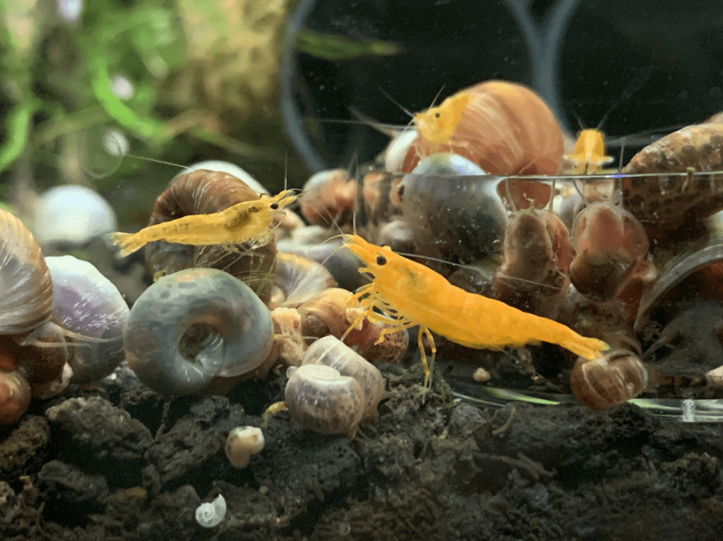 Despite their name, cherry shrimp come in a huge variety of colors other than red. I personally have a colony of little orange ones! Cherry shrimp love to chow down on algae and biofilm, but they are too small to make an appreciable difference in an algae-infested tank. They are best at keeping algae from getting out of hand in an established aquarium.